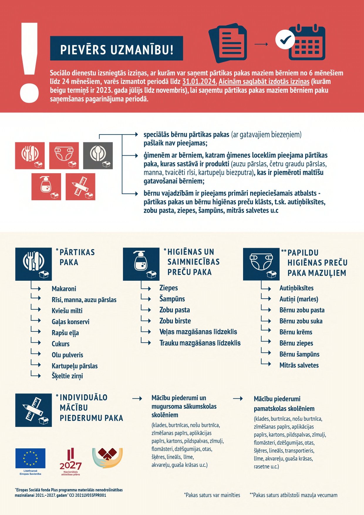 Sabiedrības integrācijas fonds (SIF) informē, ka saistībā ar iepirkuma prasībām neatbilstošiem piedāvājumiem īslaicīgi nebūs iespējams nodrošināt pārtikas preču pakas maziem bērniem (vecumā no 6 līdz 24 mēnešiem).
