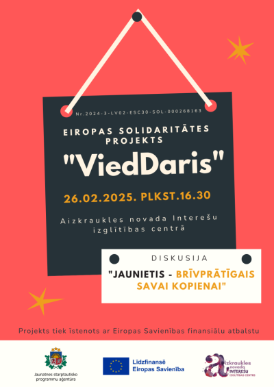 Turpinot Eiropas Solidaritātes projekta “ViedDaris” (Nr. 2024-3-LV02-ESC30-SOL-000268163) īstenošanu, 26. februārī pulksten 16.30 tiksimies Aizkraukles novada Interešu izglītības centrā, lai piedalītos līdzdalības darbnīcā “Jaunietis – brīvprātīgais savai kopienai”, kurā runāsim un diskutēsim par līdzdalības tēmu – kādi ir līdzdalības veidi, kāpēc līdzdalība kopienas dzīvē ir būtiska, ko tā sniedz, kādas iespējas tā paver pašam un kādas – kopienai?