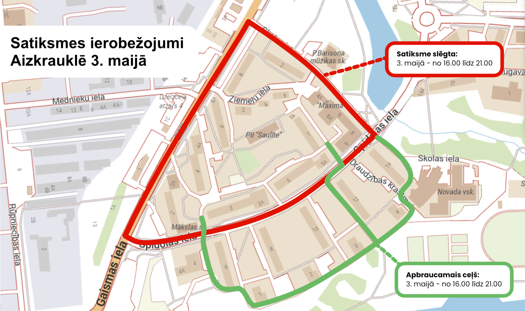 Būs īslaicīgi satiksmes ierobežojumi laikā no 9.30 līdz 9.50 Jaunceltnes ielā no Gaismas līdz Enerģētiķu ielai un Enerģētiķu ielas posmā no Jaunceltnes līdz Tilta ielai.