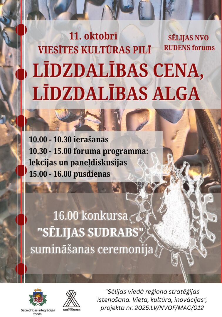 11. oktobrī Viesītes Kultūras centrā “Sēlija” norisināsies piektais Sēlijas nevalstisko organizāciju (NVO) forums. Tajā tiks apspriests, kāda ir cena, ko par pilsonisko līdzdalību maksā aktīvie iedzīvotāji. Savukārt pēcpusdienā notiks apbalvojuma “Sēlijas sudrabs” pasniegšanas ceremonija.