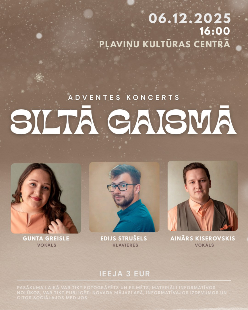 6. decembrī pulksten 16.00, Pļaviņu kultūras centrā – Adventes koncerts “Siltā gaismā”. Ieeja – 3 eiro.