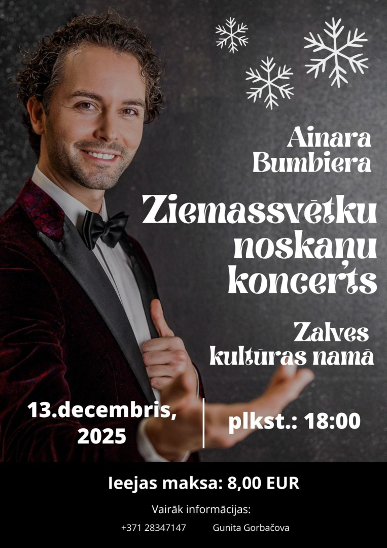 13. decembrī plkst. 18.00, Zalves kultūras namā, Ainara Bumbiera Ziemassvētku noskaņu koncerts. Ieejas maksa – 8 eiro. Vairāk informācijas: 28347147.