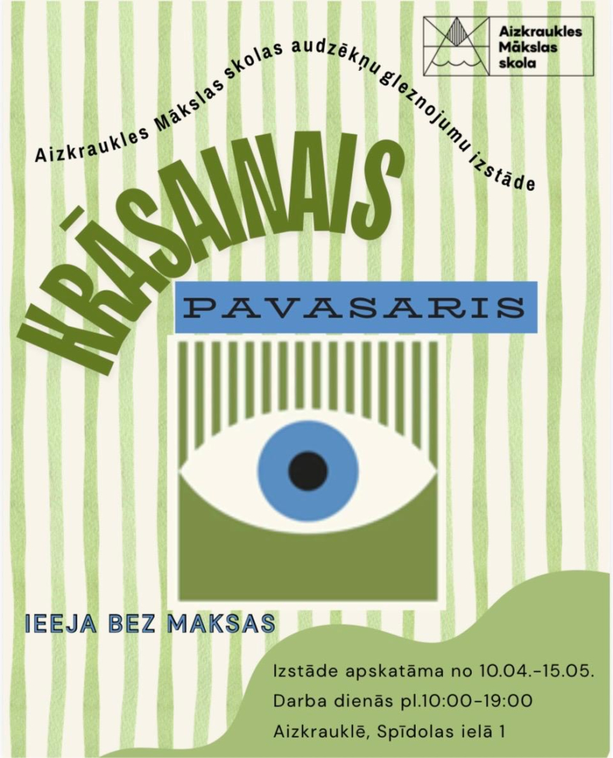 No 10. aprīļa līdz 15. maijam, darba dienās plkst. 10:00–19:00, Aizkrauklē, Spīdolas ielā 1 – Aizkraukles Mākslas skolas audzēkņu gleznojumu izstāde "Krāsainais pavasaris". Ieeja bez maksas.
