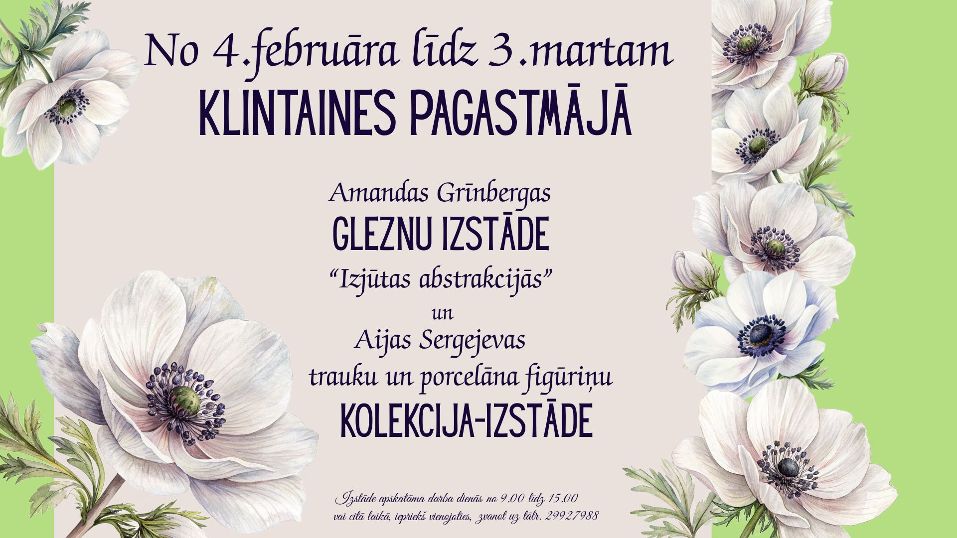No 2. februāra līdz 3. martam, Klintaines pagastmājā – Amandas Grīnbergas gleznu izstāde “Izjūtas abstrakcijās” un Aijas Sergejevas porcelāna figūriņu un trauku kolekcija-izstāde. Izstāde apskatāma darba dienās no 9.00-15.00 vai citā laikā, iepriekš vienojoties, zvanot uz tālruni 29927988.