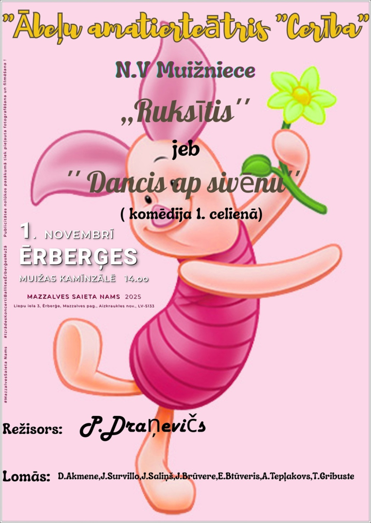 1.novembrī plkst. 14.00 Ērberģes muižas kamīnzālē amatierteātra "Cerība" izrāde "Ruksītis jeb dancis ap sivēnu"