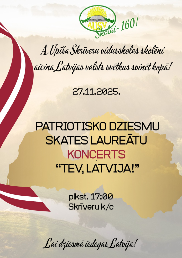 27. novembrī plkst. 17.00, Skrīveru kultūras centrā, Andreja Upīša Skrīveru vidusskolas skolēnu patriotisko dziesmu skates laureātu koncerts “Tev, Latvija!”. Lai dziesmā iedegas Latvija!