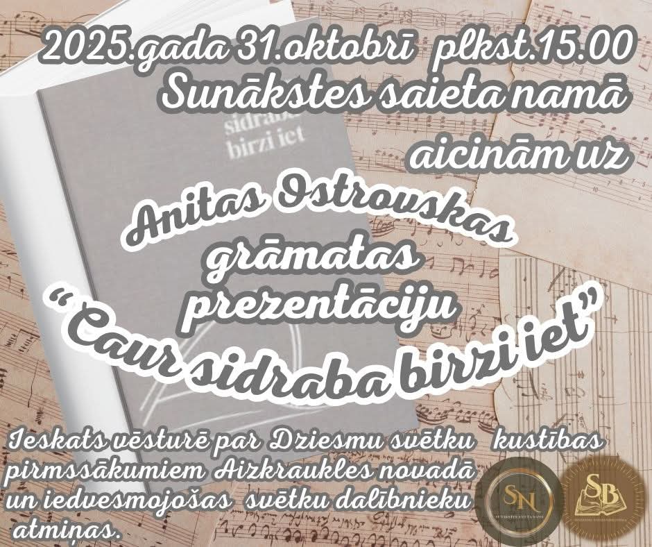 31. oktobrī plkst. 15.00, Sunākstes saieta namā Anitas Ostrovskas grāmatas “Caur sidraba birzi iet” prezentācijas pasākums