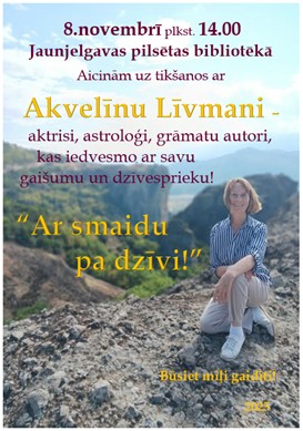 8. novembrī plkst. 14.00, Jaunjelgavas pilsētas bibliotēkā, “Ar smaidu pa dzīvi” – tikšanās ar aktrisi, astroloģi, iedvesmojošu grāmatu autori Akvelīnu Līvmani