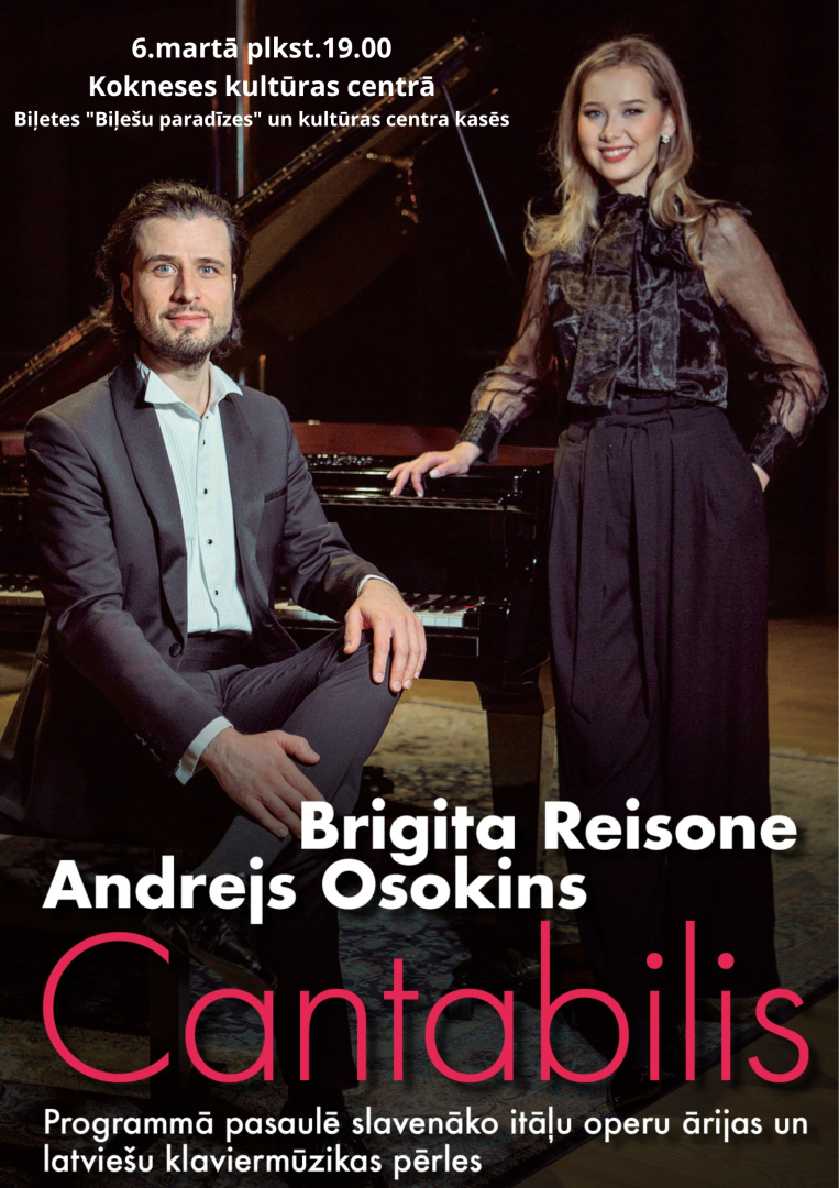 2026. gada 6. martā plkst. 19.00, Kokneses kultūras centrā, Brigita Reisone un Andrejs Osokins ar pasaulē slavenāko itāļu operu āriju un latviešu klaviermūzikas pērļu programmu "Cantabilis".