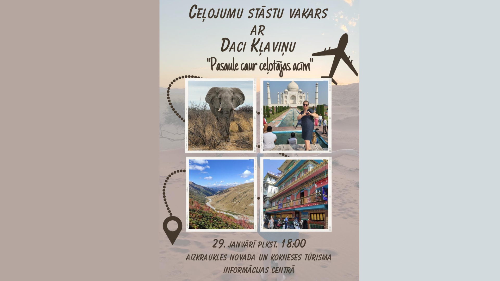 29. janvārī plkst. 18.00, Aizkraukles novada un Kokneses tūrisma informācijas centrā notiks ceļojumu stāstu vakars "Pasaule ar ceļotājas acīm" kopā ar Daci Kļaviņu. Dace Kļaviņa dalīsies dažādu ceļojumu pieredzes stāstos un ikvienu klausītāju iedvesmos 2026.gadā ieplānot kādu tuvāku vai tālāku ceļojumu.