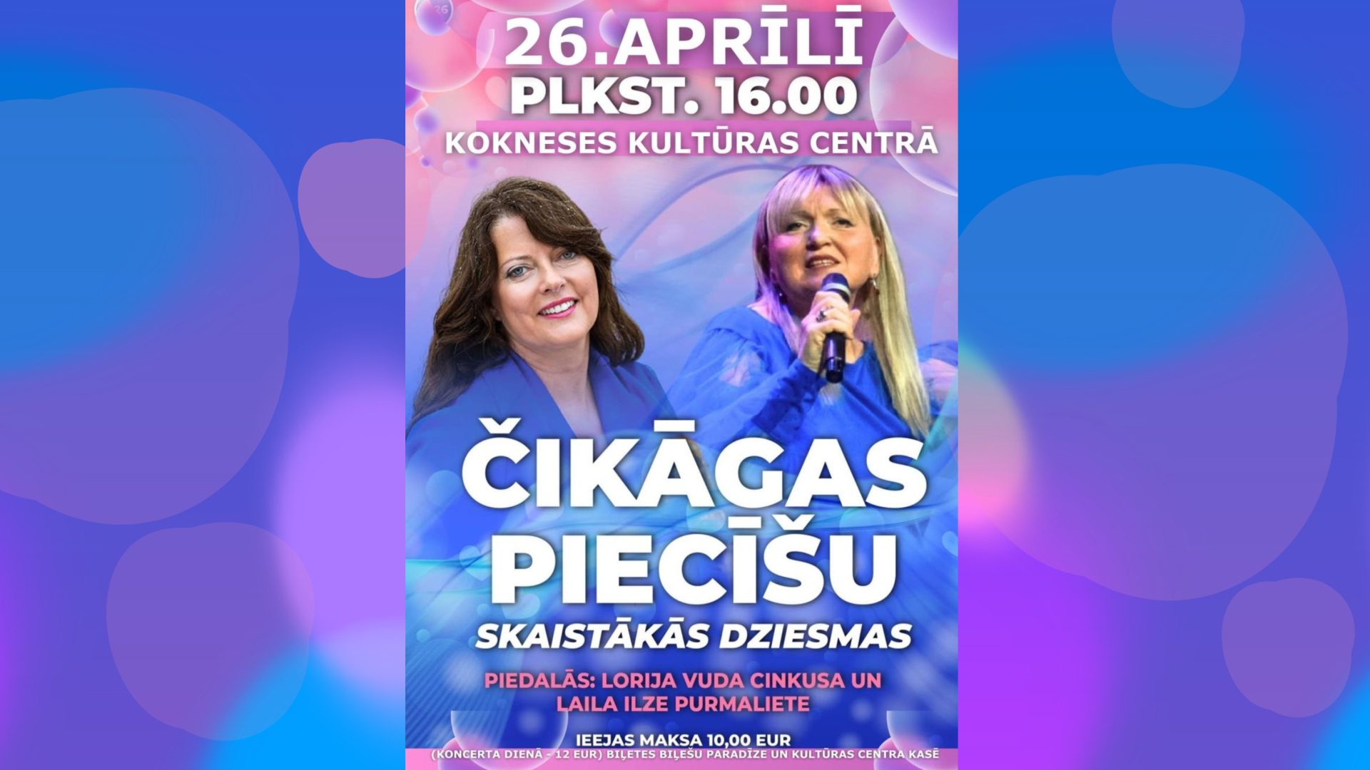 26. aprīlī plkst. 16.00, Kokneses kultūras centrā – “Čikāgas piecīšu” skaistākās dziesmas. Piedalās Lorija Vuda Cinkusa un Laila Ilze Purmaliete. Ieeja – 10 eiro, koncerta dienā – 12 eiro. Biļetes: “Biļešu paradīzes” un kultūras centra kasēs.