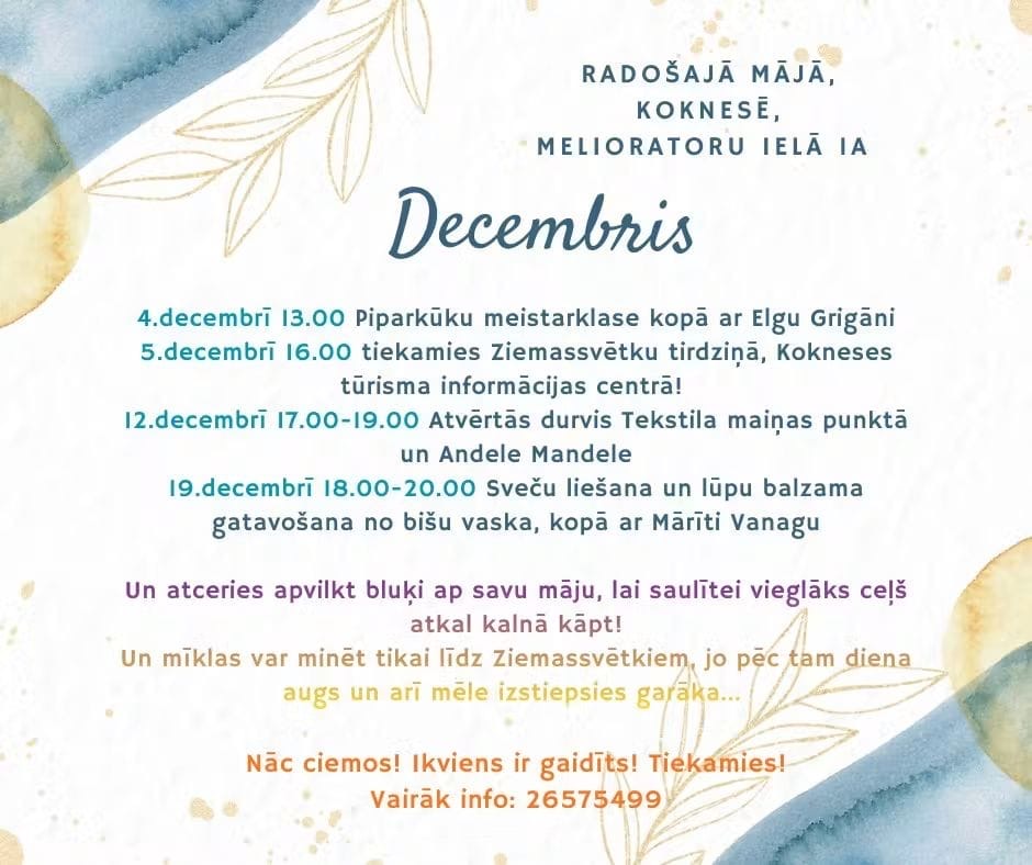 Decembris Radošajā mājā Koknesē – meistarklases, tirdziņš, sveču liešana, tekstila maiņas punkts.