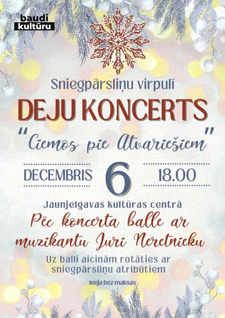 6. decembrī plkst. 18.00, Jaunjelgavas kultūras centrā, Deju koncerts sniegpārsliņu virpulī “Ciemos pie Atvariešiem”. Pēc koncerta balle ar muzikantu Juri Neretnieku. Uz balli aicinām rotāties ar sniegpārsliņu atribūtiem. Ieeja bez maksas.