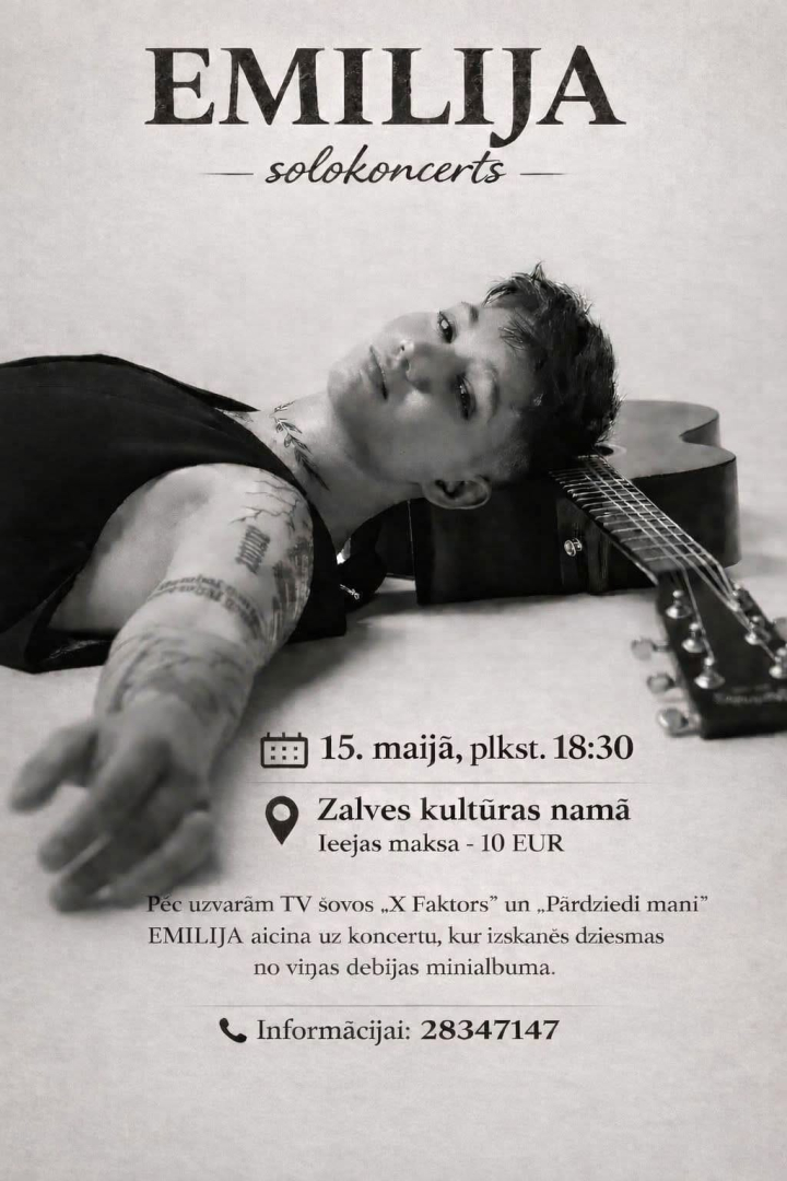 15. maijā plkst. 18.30, Zalves kultūras namā – Emilija solokoncerts. Ieejas maksa 10 EUR.