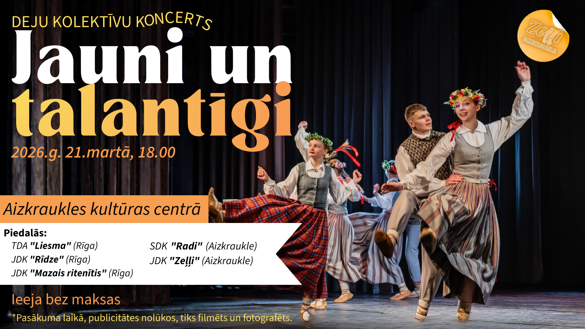 Deju kolektīvu koncerts "Jauni un talantīgi", Aizkraukles kultūras centrā, 21. martā, 18.00.