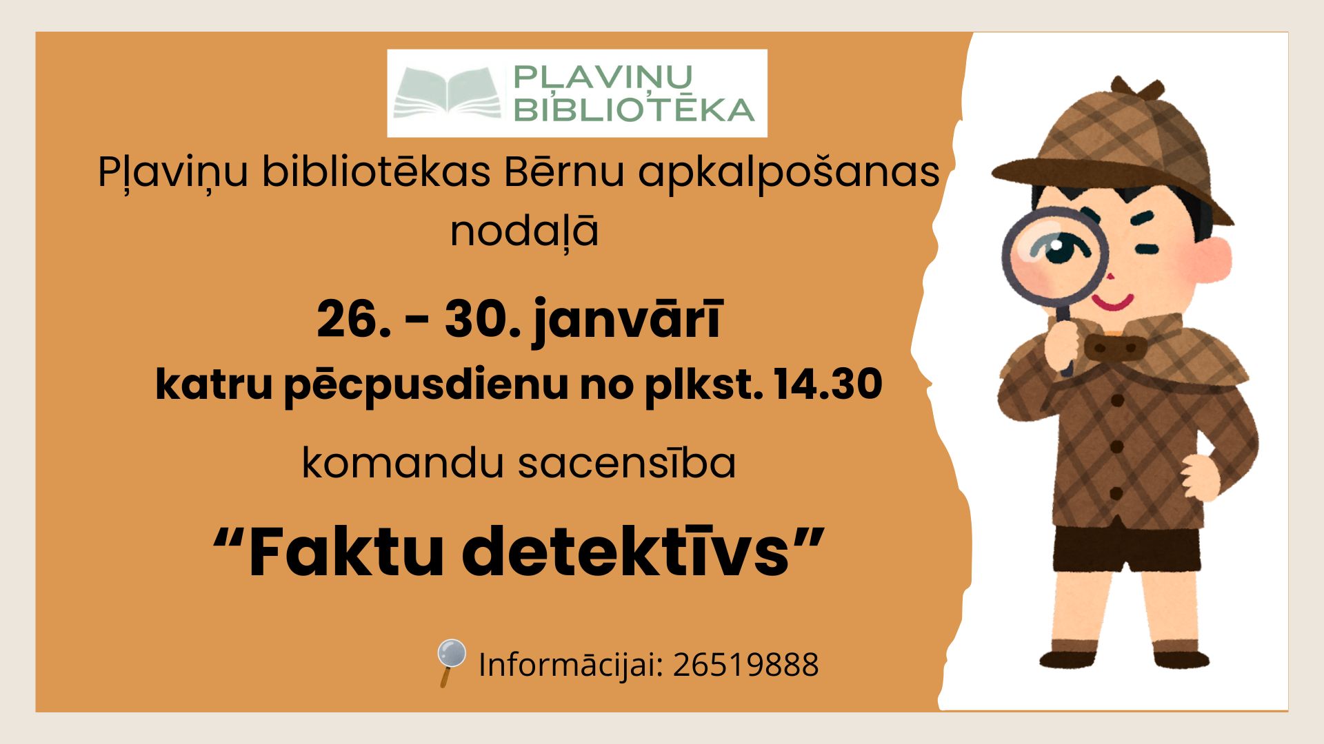 26.01.-30.01. | no 14.30 | Pļaviņu bibliotēkas Bērnu apkalpošanas nodaļā | Komandu sacensība “Faktu detektīvs”. Info: 26519888