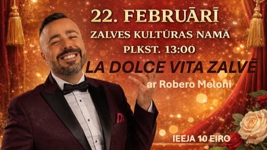 22. februārī plkst. 13.00, Zalves kultūras namā – Koncerts “La Dolce Vita Zalvē” ar Roberto Meloni. Ieeja – 10 eiro.