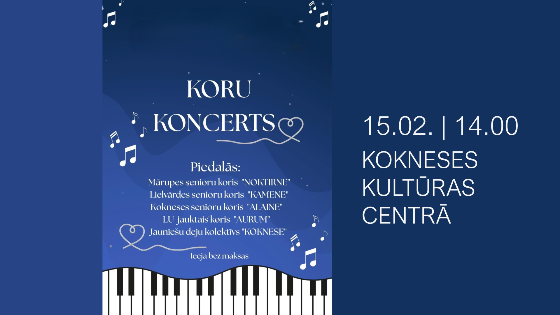 15. februārī plkst. 14.00, Kokneses kultūras centrā – Koru koncerts. Piedalās kori “Noktirne”, “Kamene”, “Alaine”, “Aurum”, jauniešu deju kolektīvs “Koknese”. Ieeja bez maksas.