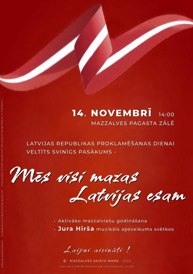 14. novembrī plkst. 14.00, Mazzalves pagastā, Latvijas Republikas proklamēšanas dienai veltīts svinīgs pasākums “Mēs visi mazas Latvijas esam”.