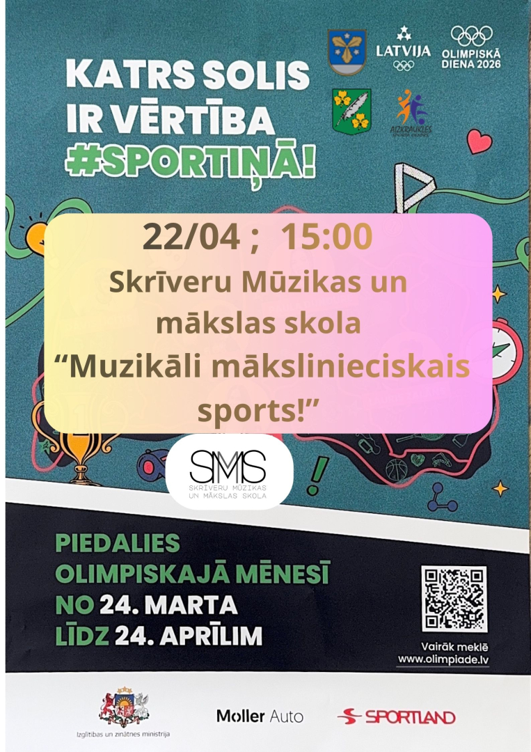 22. aprīlī pulksten 15.00 pie Skrīveru Mūzikas un mākslas skolas Daugavas ielā 85 notiks pasākums “Muzikāli mākslinieciskais sports” ‒ skolas saimes sportiskās atjautības un uzmanības spēles, apvienojot sportisko ar mākslas un mūzikas pieskārienu.