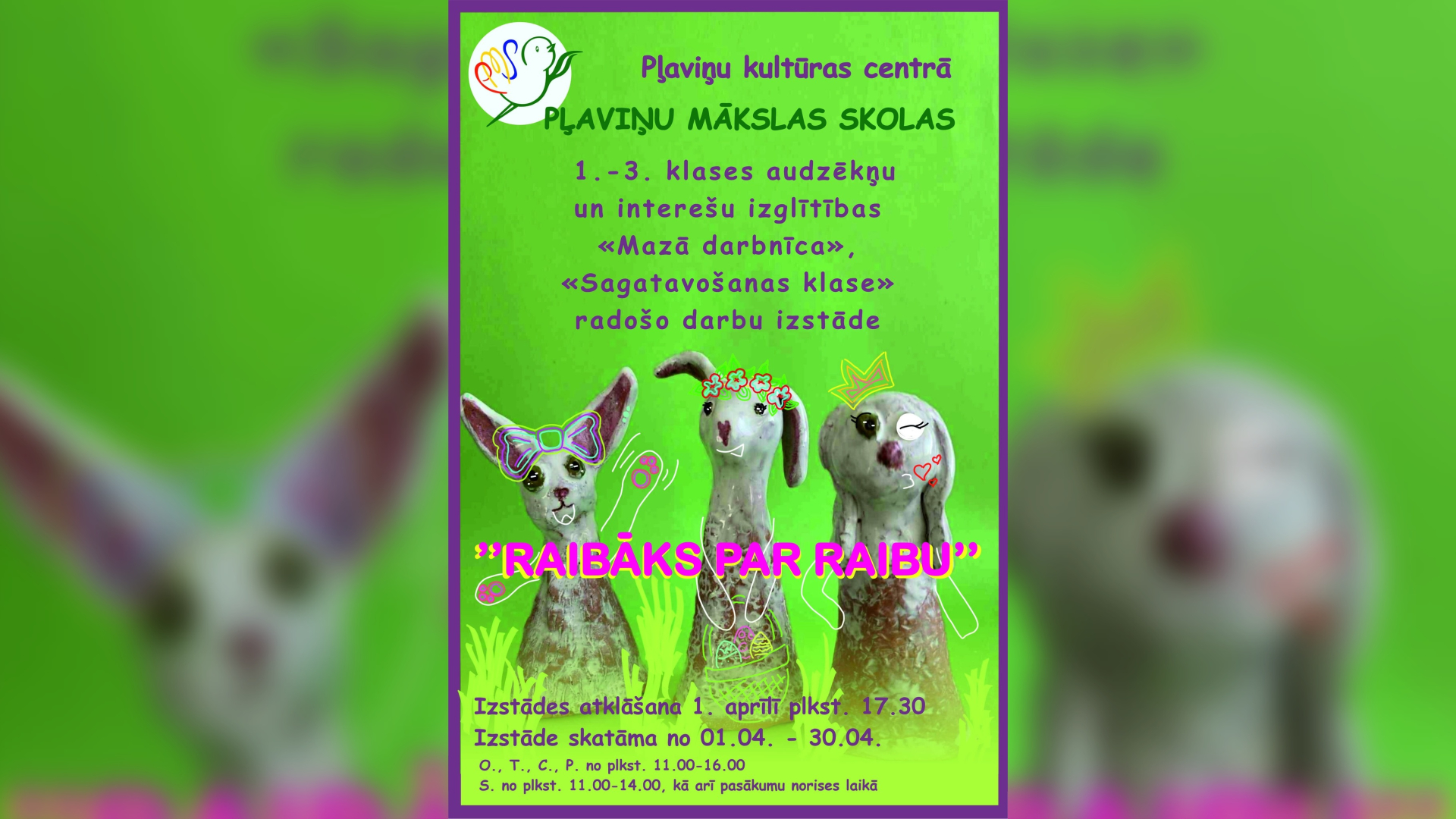 No 1. aprīļa līdz 30. aprīlim, Pļaviņu kultūras centrā – Pļaviņu mākslas skolas 1.-3. klases audzēkņu un interešu izglītības "Mazā darbnīca", "Sagatavošanas klase" radošo darbu izstāde "Raibāks par raibu".