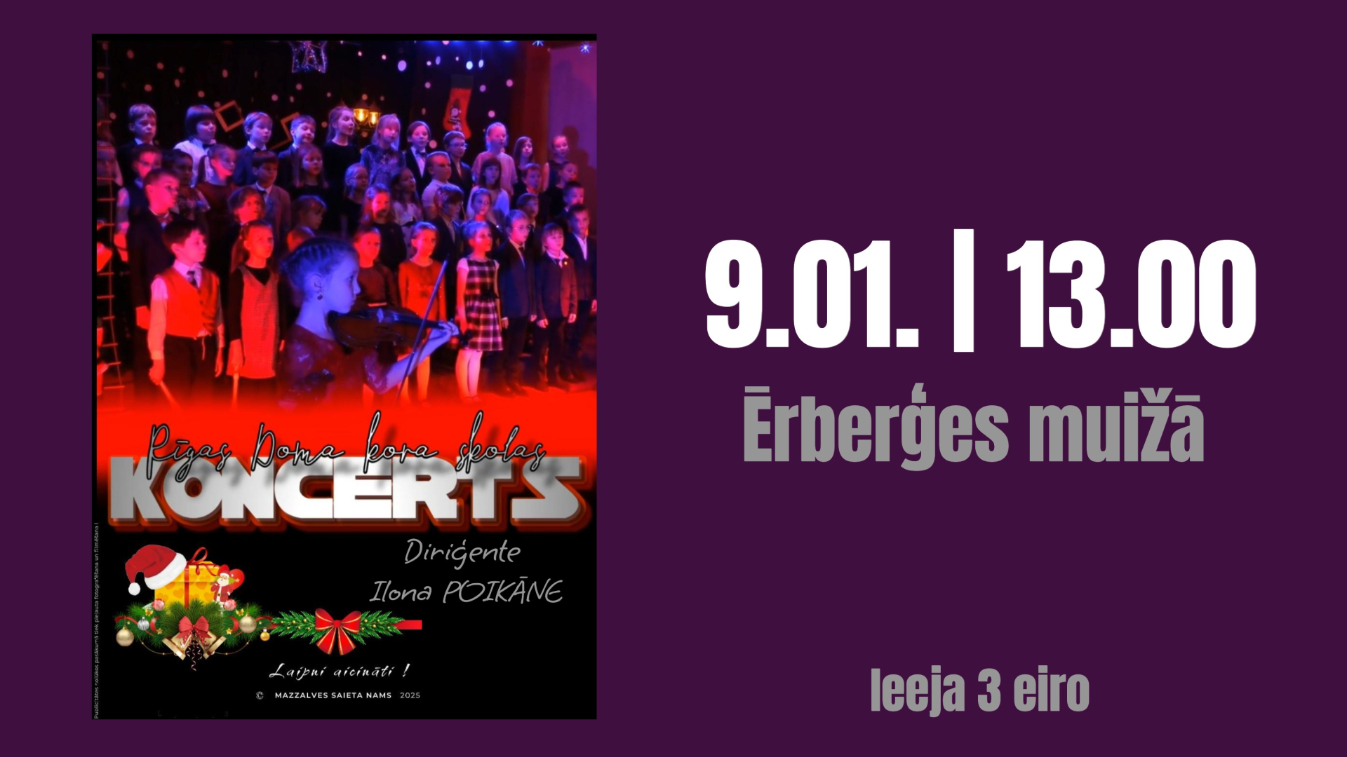 9.01. | 13.00 | Ērberģes muižā | Rīgas Doma kora skolas koncerts. Diriģente Ilona POIKĀNE. Ieeja 3 eiro. Mazzalves pamatskolas audzēkņiem ieeja bez maksas.