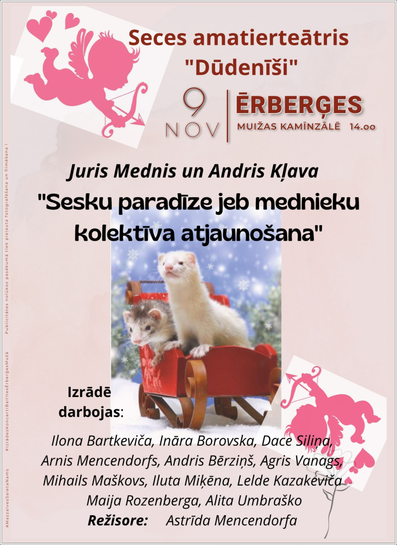 9. novembrī plkst. 14.00, Ērberģes muižas kamīnzālē, Seces amatierteātra “Dūdenīši” Jura Medņa un Andra Kļavas lugas “Sesku paradīze jeb mednieku kolektīva atjaunošana” izrāde. Režisore Astrīda Mencendorfa