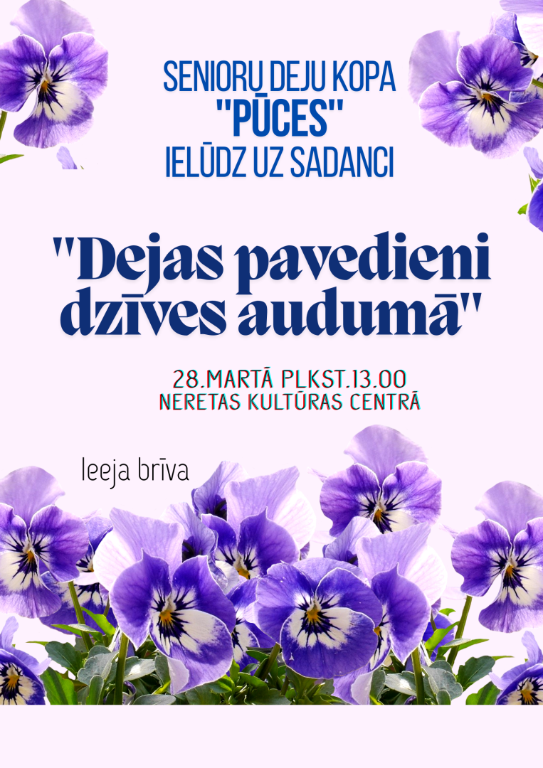 28. martā plkst. 13.00, Neretas kultūras centrā – Senioru deju kopa “Pūces” ielūdz uz sadanci “Dejas pavedieni dzīves audumā”. Ieeja – bez maksas.