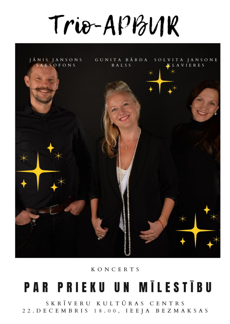 22. decembrī pulksten 18.00 Skrīveru kultūras centrā – “Trio-Apbur” Ziemassvētku koncerts “Par prieku un mīlestību”.