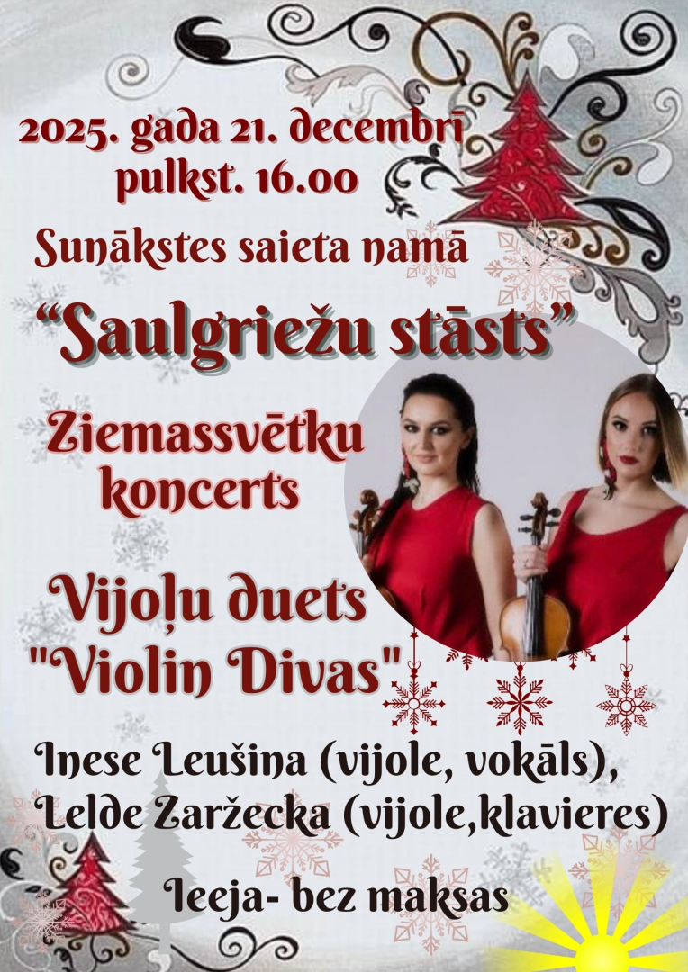 21. decembrī pulksten 16.00, Sunākstes saieta namā – vijoļu dueta “Violin Divas” Ziemassvētku koncerts “Saulgriežu stāsts”. Inese Leušina (vijole, vokāls), Lelde Zaržecka (vijole, klavieres). Ieeja – bez maksas.