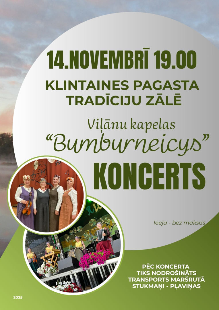14. novembrī plkst. 19.00, Klintaines pagasta tradīciju zālē, Viļānu kapelas “Bumburneicys” koncerts. Ieeja bez maksas. Pēc koncerta tiks nodrošināts transports maršrutā Stukmaņi-Pļaviņas