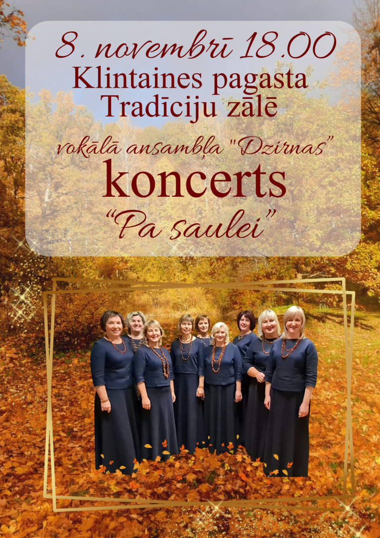 8. novembrī plkst. 18.00, Klintaines pagasta tradīciju zālē, vokālā ansambļa “Dzirnas” koncerts “Pa saulei”.