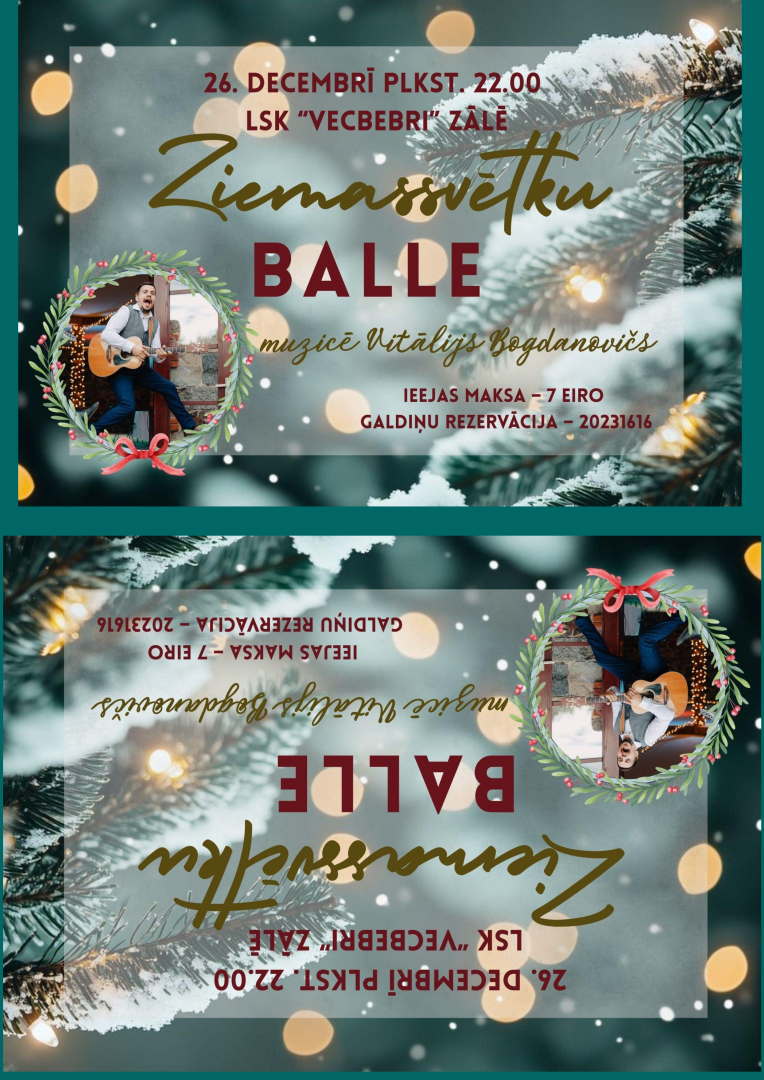 26. decembrī pulksten 22.00 LSK “Vecbebri” zālē – Ziemassvētku balle. Muzicē Vitālijs Bogdanovičs. Galdiņu rezervācija pa tālruni 20231616. Ieeja – 7 eiro.