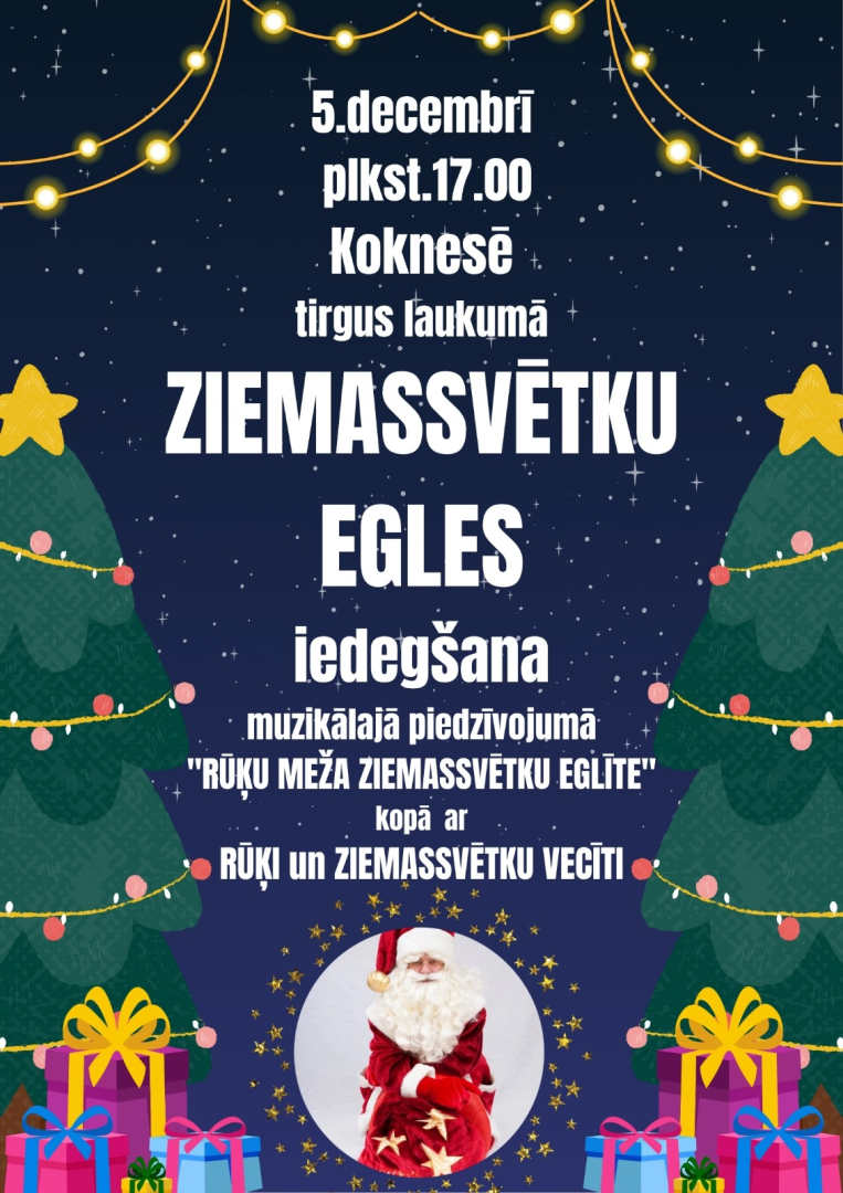 5. decembrī plkst. 17.00, Kokneses tirgus laukumā, Ziemassvētku egles iedegšana kopā ar Rūķi un Ziemassvētku vecīti “Rūķu meža Ziemassvētku eglīte”