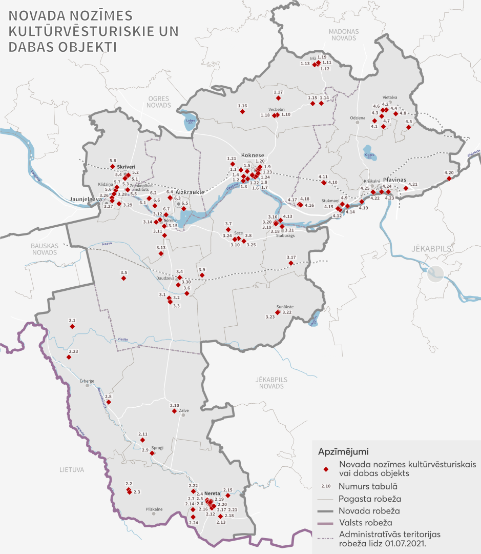 Kokneses apvienības teritorijā kā novada nozīmes kultūrvēsturiskie un dabas objekti noteikti 24, Neretas apvienības teritorijā 24, Jaunjelgavas apvienības teritorijā 30, Pļaviņu apvienības teritorijā 25, Skrīveru apvienības teritorijā 8 un Aizkraukles pagastā un pilsētā tie noteikti 7. Kopā novadā noteikti 124 novada nozīmes kultūrvēsturiskie un dabas objekti noteikti.